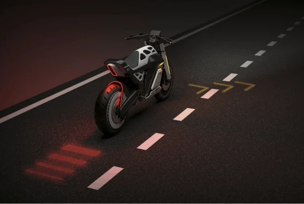 The motorcycle is designed in SOLIDWORKS and integrates modern safety technologies to improve rider visibility and protection.