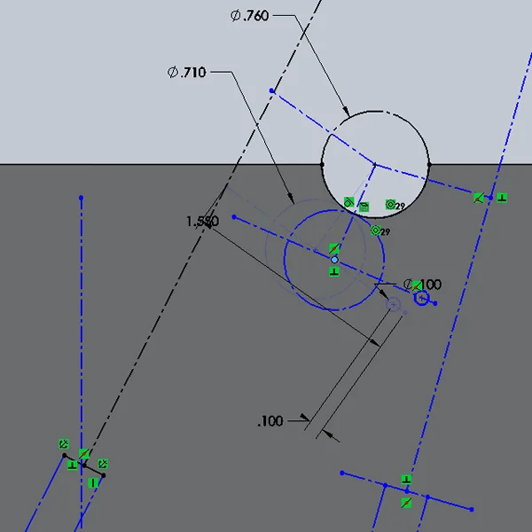 As you can see, the roller is tangent to the camshaft axle and can “swing” in search of a position. The next image shows the finger locked into place and the .100’’ circle that is ready to be used in an extruded cut lengthwise along the cylinder head part. The angle between the finger and the valve (or the lines that represent them) is almost 90 degrees, so that when the finger is going to be hit by the exccentricity of the cam and pushed down, the angle will reach 90 and slightly over, but not reach extreme values (because of the fixed length of the finger, if it rotates too much it does not touch the head of the valve anymore).