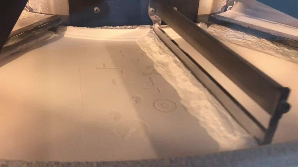 SLS is a method of 3D printing where a thin layer of powdered material is deposited with a coating blade into a bin. A laser will then fill out the profile of that layer in the powder, forming a solid object. The bin will then move down the depth of the layer height and deposit more powdered material in the bin. The laser will again sinter the material on that layer as well to the layer below. The powder creates a self suspended part that requires no support. This allows you to design complex shapes.