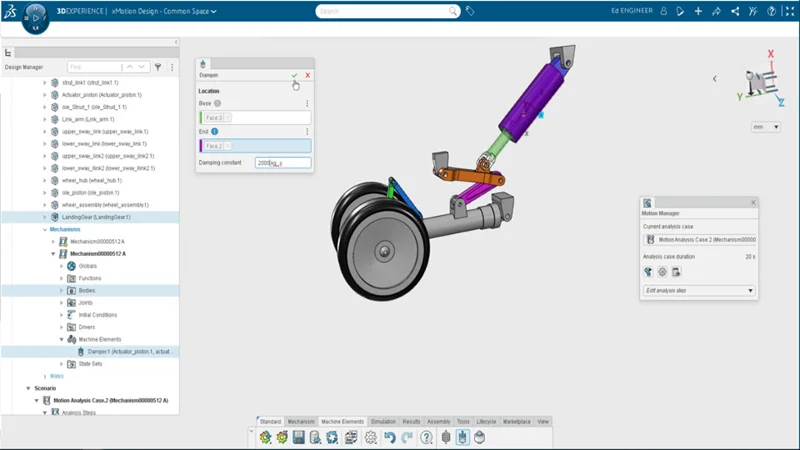 A new Damper command allows you to add a damping effect and tweak the value to test various states. For instance, you can add a damper on two cylindrical faces of a mechanical system, such as airplane wheels, to mimic making a landing smoother by better absorbing the shock impact.