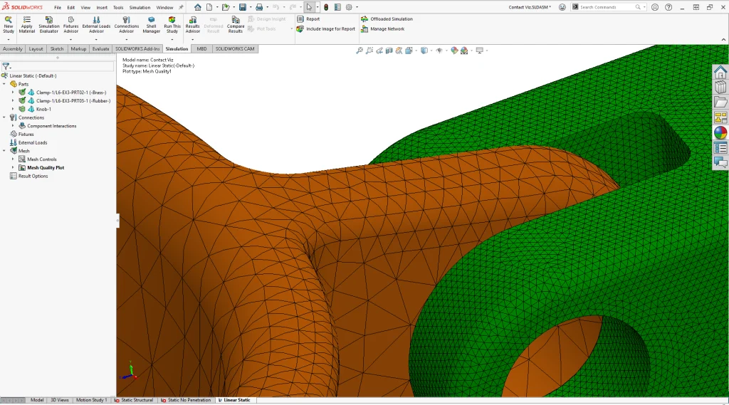 Better meshing. You can’t simulate until you create a mesh. SOLIDWORKS Simulation 2021 offers a new mesh default: no enforced common modes that enables users to obtain a mesh much faster with the same accuracy as with common nodes between parts. Also new mesh diagnostics enable users to identify, isolate, and be prompted when poor quality elements need to be fixed, improving mesh quality.