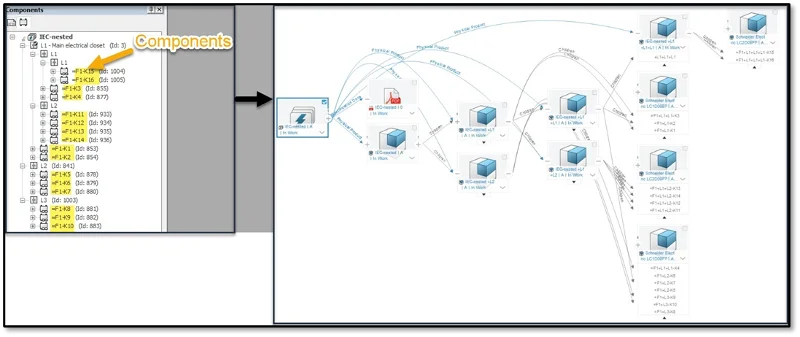 Use when designing electrical control panels or harnesses to link drawing component views to the corresponding symbols in the original schematic.