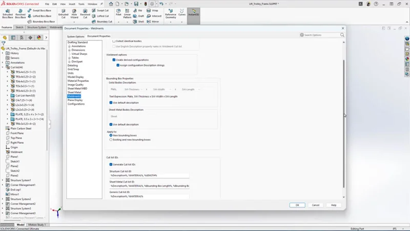 Once you choose your preferred unit settings (such as inches, pounds and seconds) under Document Settings, go to Weldments and choose “Apply Document Units to Cutlist IDs.”