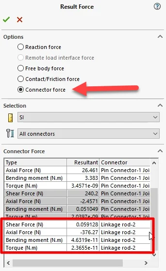 Once your simulation has solved, you can post process Shear Force and Axial Force, Bending moment and Torque for the Linkage Rod connector as shown in Fig 3. How cool is that?