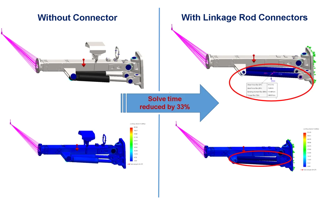 Let’s look at an example to see how the linkage rod connector can save you time. Instead of modeling the two pneumatic pistons on a Resemin Bolter truck (which are not the objects of interest since the high stress concentrations occur in the components above) we use the Linkage Rod connector to represent them. The assembly using the Linkage Rod connector to represent the pneumatic pistons solved in 3:01 minutes (with connector) whereas the assembly where we kept the pneumatic pistons without using connectors solved in 4:30 minutes (without connectors), or a reduction in solve time of 33%.