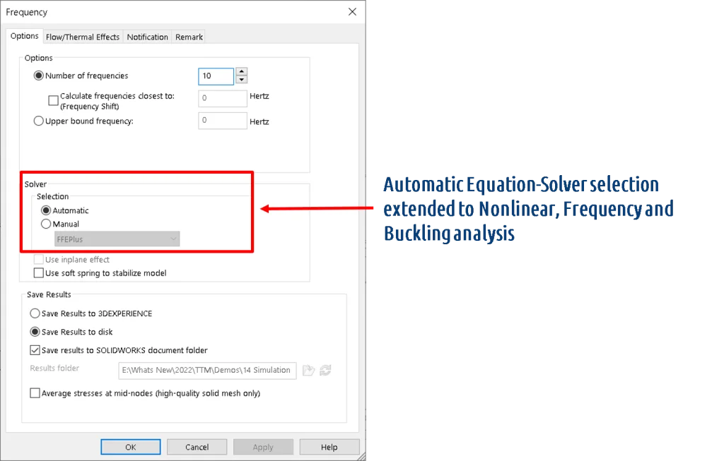 SOLIDWORKS Simulation 2022 includes an enhancement that selects the best equation solver for Nonlinear, Frequency, and Buckling studies. The selection of the best equation solver (Intel Direct Sparse or FFEPlus Iterative) depends on the number of equations, load cases, mesh type, geometric features, contact and connector features, and available system memory. For Frequency and Buckling studies, the automatic solver selection factors in the number of frequencies and modes in addition to the previously mentioned parameters.