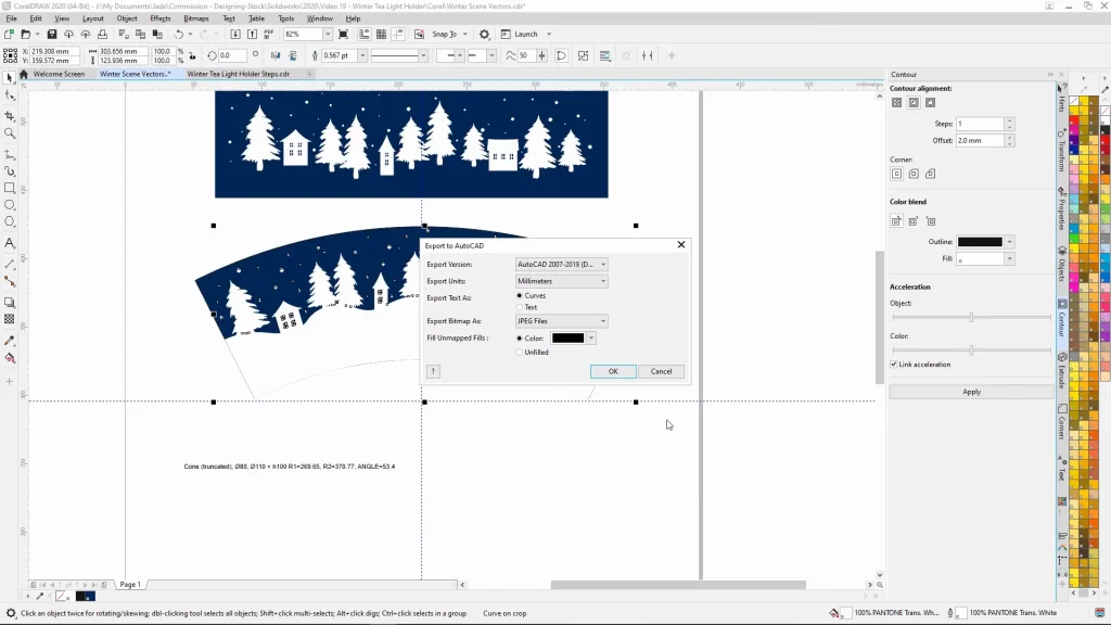 During this tutorial, I demonstrated how I get a template of the revolved glass holder. In this case I used a template generator: Link for template maker  You can either follow the link, or use the downloaded file. Using the template, I used this to fit a set of winter themed vectors along it. If you have vector software, I would definitely recommend creating your own design using the tutorial steps. If not, you can use the Winter Scene DXF file. One step that I found very important for creating a wrap design to fit all the way around the glass face was to leave a slight gap at the join, and make the design slightly smaller, otherwise the wrap sketch intersects and overlaps itself, stopping the feature from working.