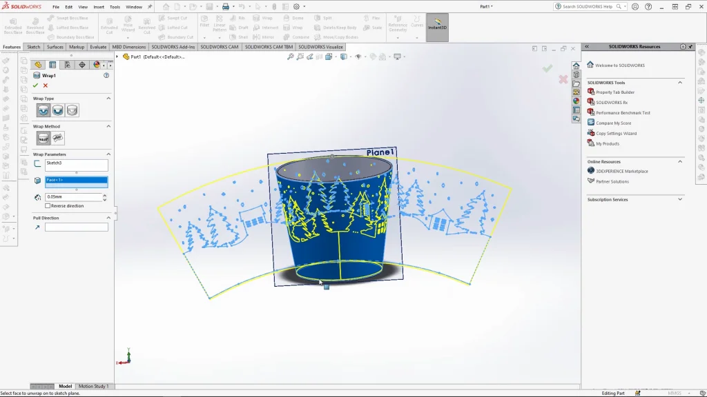 Before bringing the sketch in, you need to ensure that your plane for the wrap feature is tangent to the face to wrap the sketch analytical. When the DXF file is brought in to use for the wrap feature, looking at the feature preview, you can see the gap in the sketch as it wraps around the glass. A simple boundary boss was used to fill this gap in. The wrap feature is embossed at 0.05mm, this is because I didn’t want the emboss to be a visible extrusion. it was added to allow me to add a different appearance to the winter scene.