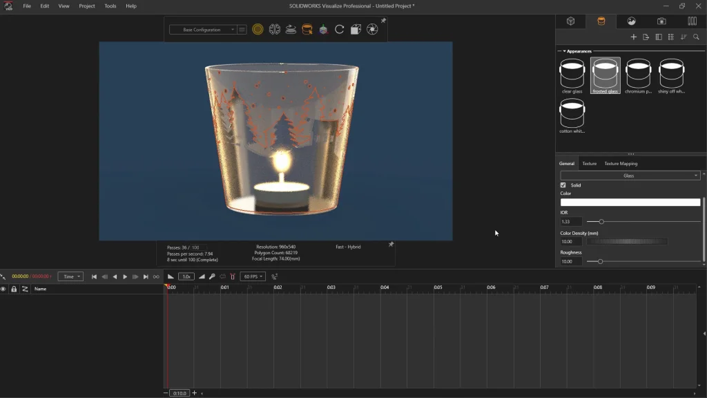 Appearances were added to the final design and was then saved. The glass was then inserted into an assembly where the tea light part could be added and mated inside of the glass. Once the assembly was complete it was exported directly to SOLIDWORKS VISUALIZE. In the tutorial I demonstrate how to render the design, by adding an area light to the tea light part and editing the final appearances of the glass holder. I also show you how to play around with the background color, brightness and floor appearances. The most important aspect of the render settings were the edits I made to the glass appearances. I played around with the glass index of refraction, but also the roughness of the glass, this really made the final render realistic.