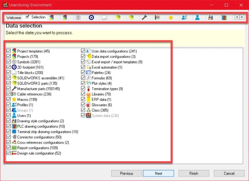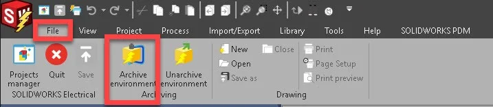 - Perform an Archive of the current SOLIDWORKS Electrical environment from your company system.