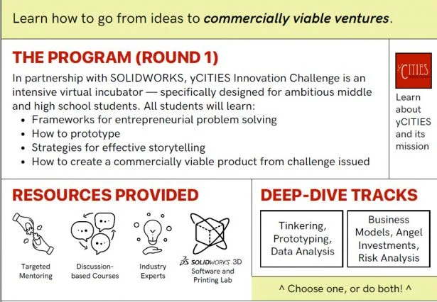 yCITIES Innovation Challenge is an entrepreneurial problem-solving bootcamp specifically designed for ambitious middle and high school students who believe they have the potential to make societal impact as an innovator and leader. In this challenge, accepted students will learn frameworks and processes to determine how to go from an idea to a commercially viable solution.
