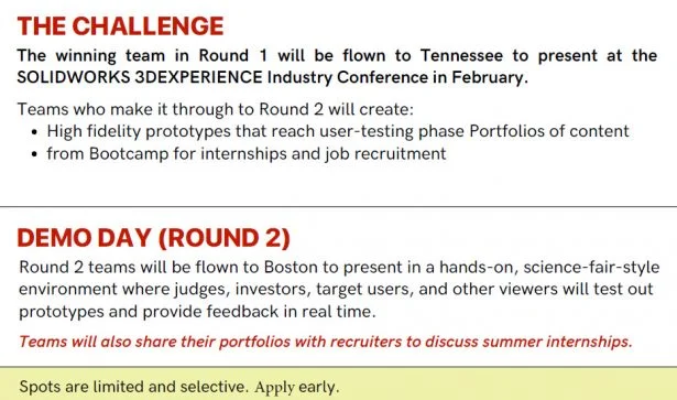 While 3D printed prototypes and other physical/virtual outputs are required, students do not have to have a technical background. Many different types of skills, background, and personalities are required to make a solid team to design, create, analyze data, assess risk, determine the best business models, and beyond.