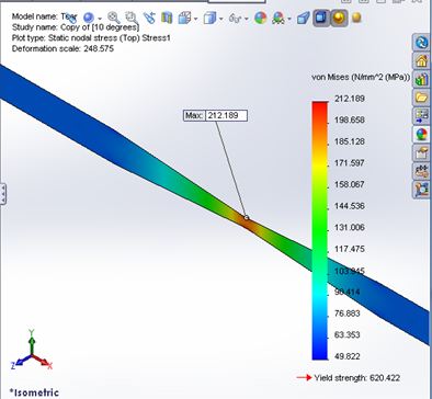 All I did here was increase the angle of the cut from 10 to 170 degrees. This removes 13% of the original bar. So what did this do to the stress? Let's take a look: