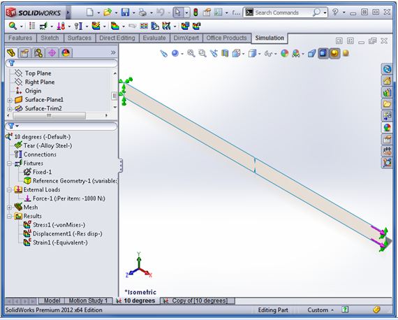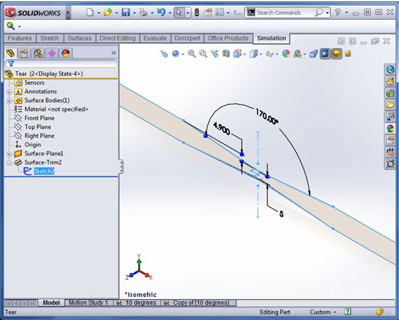 I fired up SolidWorks and modelled a simple strip with two small tears on each side. Keeping things symmetrical helped with the setup.