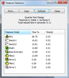 Also in comparing our 1/2 to our whole model we are starting to see a saving in overall rebuild time as our Rib on the Full part takes twice as long to rebuild. The other advantage of creating a Half model is the benefit of only have to create 1/2 of the sketch entities and relations so there is less that can potentially go wrong with changes in the future.
