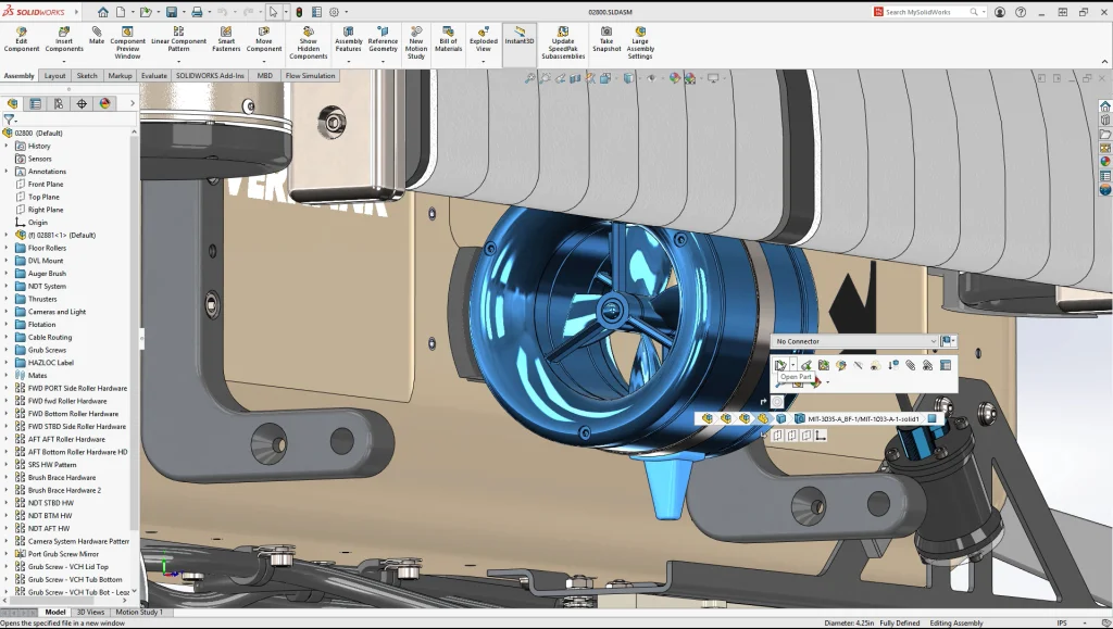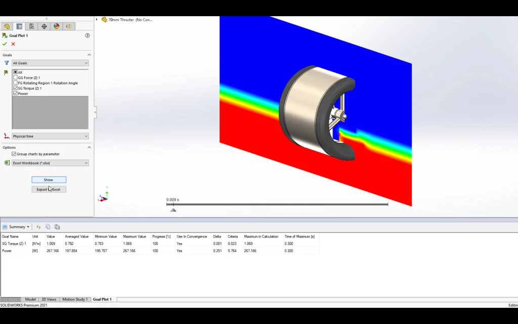 We simulated the torque and power requirements of the thruster depicted below as it interacts simultaneously with two separate fluids. We created goals to track these outputs, and by going to the history section of the Goal Plot, we monitored the torque and power values throughout the duration of the study. With SOLIDWORKS Flow Simulation 2021, additional columns in the summary table make it easier than ever to find the maximum values and when they occur.