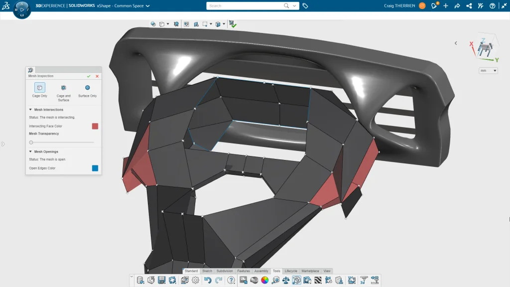 An intersecting control cage can lead to problems once the Sub-D surface is converted to NURBS and used in downstream operations. This new diagnostic tool helps you to create smoother, more aesthetically pleasing and manufacturable products. Plus, it eliminates the frustration of figuring out where the subdivision cage mesh is self-intersecting, which is especially challenging on complex models.