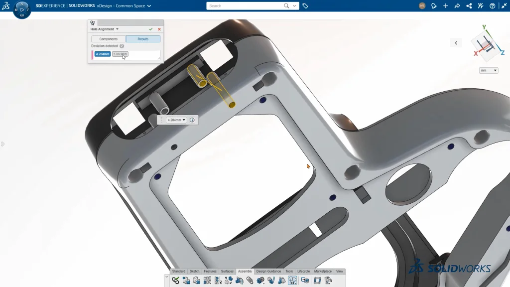 Find holes that don’t match up. A simple but important design-for-manufacture feature ensures designs are fit for assembly and identifies any misaligned holes to eliminate costly downstream delays. When two parts with holes need to match up, the hole alignment check validates that holes are aligned and fit for assembly. Reduce errors during the assembly process by validating fitness for manufacture in the design stage.