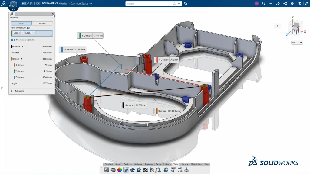 We have revamped the measure tool for more functionality and added colors at various levels for increased clarity. Also, the flags are bigger and better positioned. In addition, custom settings allow you to take measurements that are different from your system settings without changing the model’s original unit settings. Spend less time trying to take and understand measurements, be more productive, and reduce issues during manufacture.