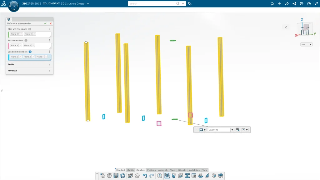 Create a reference plane member by specifying a start and end plane, axis plane(s), and location plane(s). Plane intersections automatically create a member, which reduces sketching requirements. Improve productivity when creating complex shape structures with intersection-based structure members. This command is particularly useful for creating multilevel structure systems.