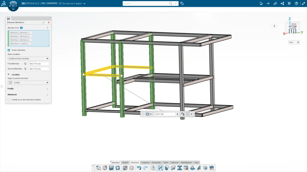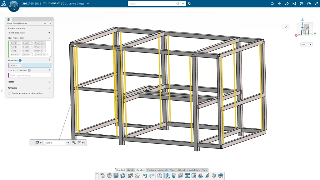 Spend less time sketching and more time designing. Create a structure member by selecting a start point and then specify either a distance, end point, or end plane. Click and drag the on-screen manipulator to quickly define the length of the member. Increase your productivity with point-based members.