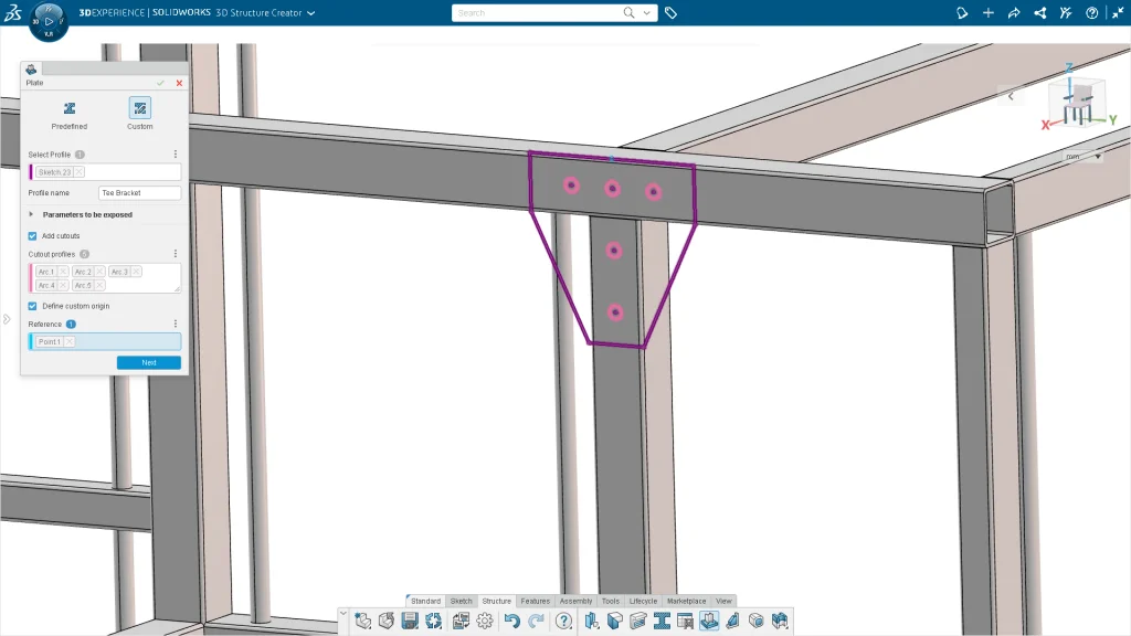 Save time creating cutouts and ensure proper hole alignment by propagating holes to structure members when placing the plates in the structure system. Design plates in context of the assembly and reuse a plate anywhere else in the design. Experience design flexibility by creating custom plates and reuse them anywhere in the design. Save time and ensure proper hole alignment by propagating holes from plates to structure members.