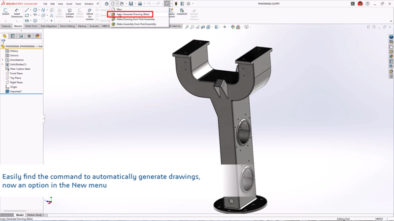 Welcome to the generative drawing experience. In this workflow, you simply open a model, hit Auto Generate Drawing (Beta) under the New menu to create a drawing sheet with views and proposed dimensions.