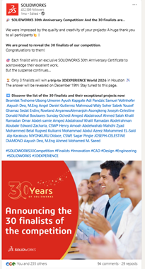 For 30 years, SOLIDWORKS has empowered engineers, designers, students and makers worldwide to bring ideas to life. To mark this milestone, the SOLIDWORKS 30th Anniversary Competition invited the global community to showcase their creativity, technical expertise and storytelling skills — directly on LinkedIn.