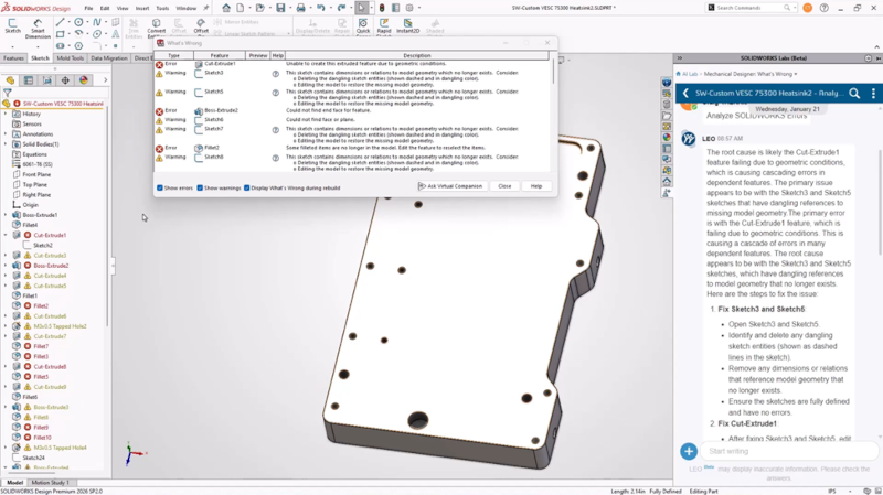 You’re all familiar with this scenario: you’re building complex parts, and you change or delete something in your model, and it causes a lot of features downstream to fail. Thankfully, with the What’s Wrong dialog box, you can get an idea of what you need to fix. However, we’ve enhanced this functionality to be even smarter, and now it will identify the root cause of the failure, so you can fix part model errors faster with AI-guided root-cause analysis.
