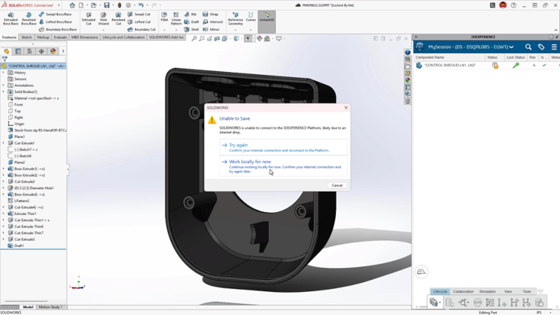Disponible depuis quelques années, l’activation du mode hors ligne a été simplifiée. En cas de perte de connexion alors que vous êtes connecté à la plate-forme 3DEXPERIENCE, vous recevez une notification et vous pouvez continuer à travailler dans SOLIDWORKS en mode hors ligne, sans avoir à enregistrer votre travail, quitter la session et démarrer une nouvelle session.