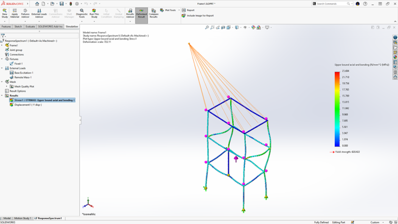 Esta versión le ayuda a aumentar la fidelidad, el control y la eficiencia de las simulaciones estructurales complejas. Las opciones de fuerza para vigas permiten definir las cargas Por elemento o Total, lo que mejora la precisión en la aplicación de carga. Además, ahora es posible extraer fuerzas detalladas en conectores de pasadores en simulaciones de vibración aleatoria, lo que ofrece un análisis más completo del comportamiento de los conectores bajo cargas dinámicas.