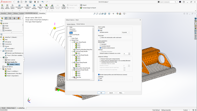 Ahorre tiempo durante la configuración estableciendo valores predeterminados globales para definiciones de vaciados gruesos o finos. Se ha incorporado una nueva opción en Opciones predeterminadas > Malla, que permite especificar si desea que los vaciados gruesos o finos se definan como predeterminados en los nuevos estudios.