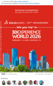 Cada ganador del gran premio recibirá un viaje exclusivo a 3DEXPERIENCE World 2026 en Houston, el evento insignia de la comunidad SOLIDWORKS.