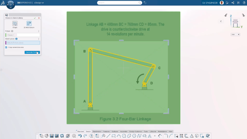 El mecanismo se convierte en un croquis totalmente restringido al reconocer objetos en la imagen (vínculos, posiciones, rodillos, etc.) y restricciones (bisagras, controles deslizantes, puntos de posición, etc.).
