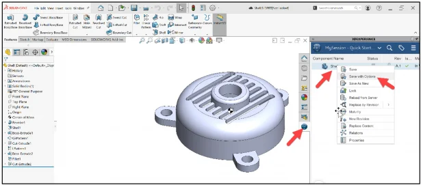 The next illustrations show how to save a SOLIDWORKS part (Shell.sldprt) directly to the Platform using a Bookmark which was created in the lesson.