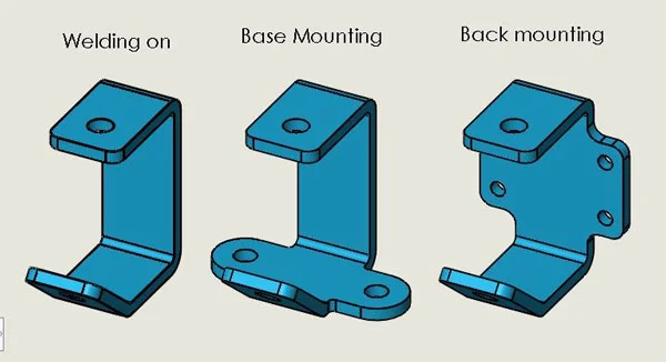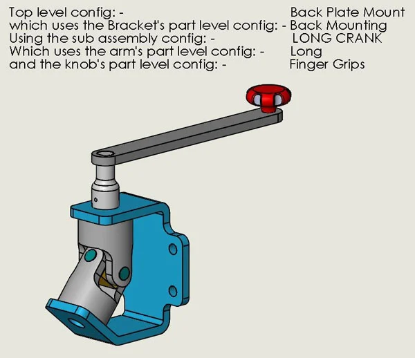This has been used in an assembly (that may be vaguely familiar to many of you), and as you can see from the picture, I have created some configurations in that top level assembly called “Basic,” “Bench Mount” and “Back Plate Mount,” and I have just selected the Bracket on screen and used the drop down list to swap the configuration of the part that is used in each configuration of the assembly: