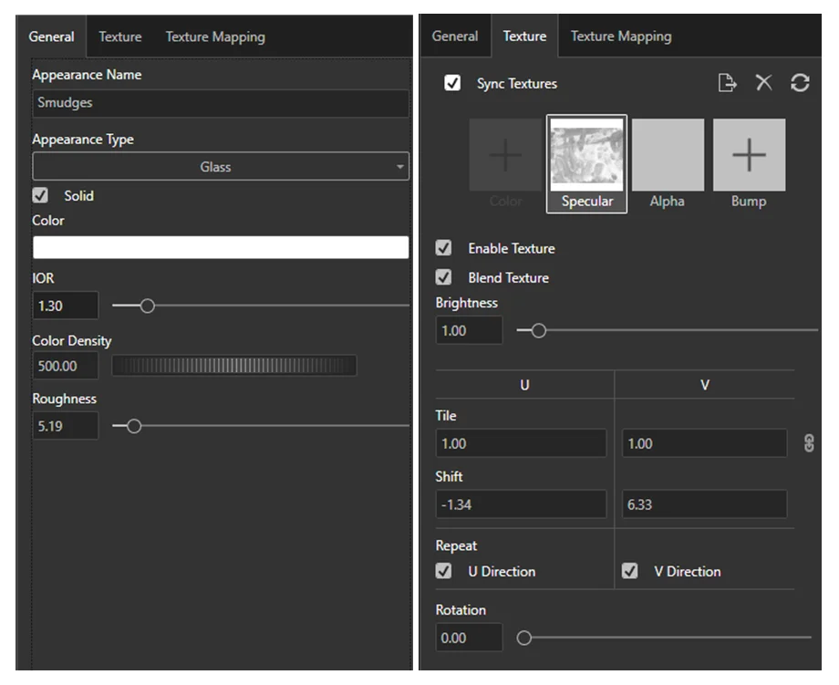 If you have more than one texture map applied on a single appearance and need to sync the textures together, make sure to check the ‘Sync Textures’ box at the top of the Textures sub-tab. For example, any size adjustment made on the Color map will also be changed on the matching Bump map.