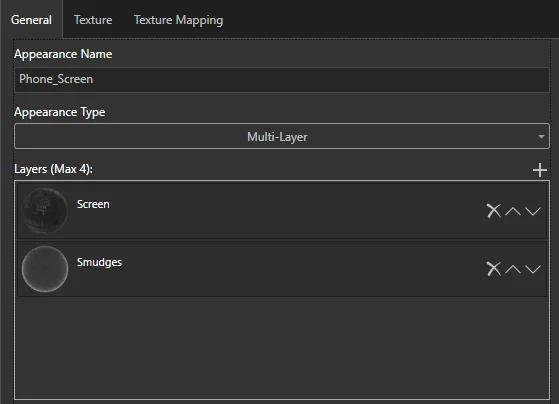 From the image above, you can see I have already stacked my two appearances together in the single Multi-Layer appearance. Clicking the little + icon will allow you to continue adding appearances – up to four of them. It’s counter-intuitive, but your base material (‘screen’ in this case) should be at the top of the list, and then your surface imperfections (‘glass’ in this case) should be below it. This will layer the smudges on top of the screen.