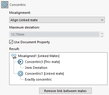 - In the Mate PropertyManager, the following settings appear Concentric:
