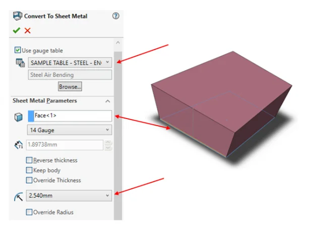 1. Define the desired thickness and bend radius either by selecting a gauge table or by entering it manually. In this example, I have used a sample table for steel and selected 14 gauge with a 2.54mm bend radius.