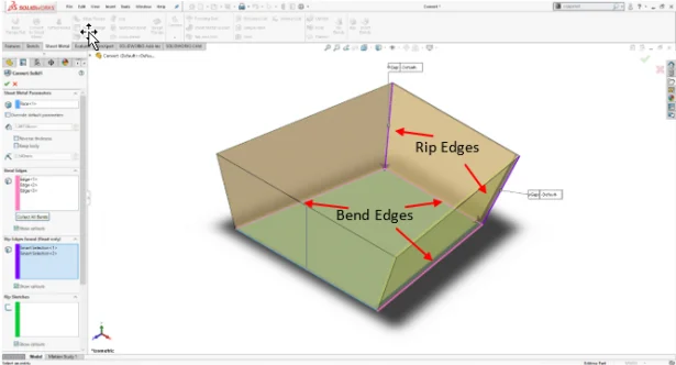 3. Select required “Bend Edges” to define the bends in the sheet metal part. SOLIDWORKS will then automatically select “Rip Edges” which create cuts in the sheet metal body.