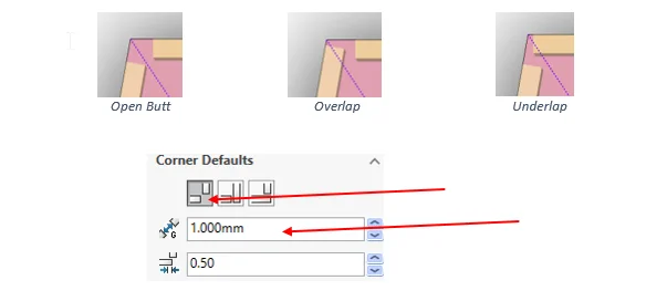 5. Where two edges meet the gap and type of corner; Open Butt, Overlap, Underlap, can be selected for all or individually. For this example, I have selected an Open Butt corner type with a 1mm gap