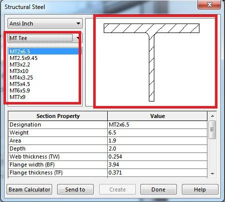 After clicking “Beam” option, new dialog box opens, Choose the preferable cross section. I choose “MTee Section” and selected MT2x6.5.