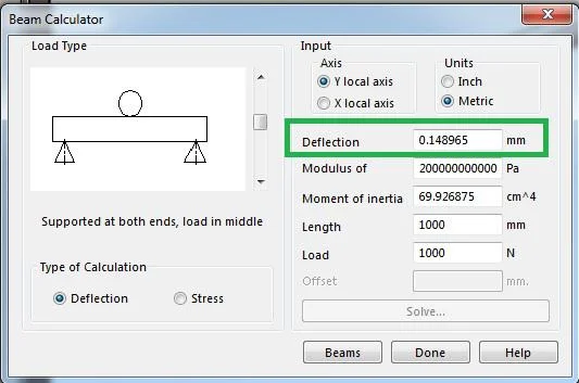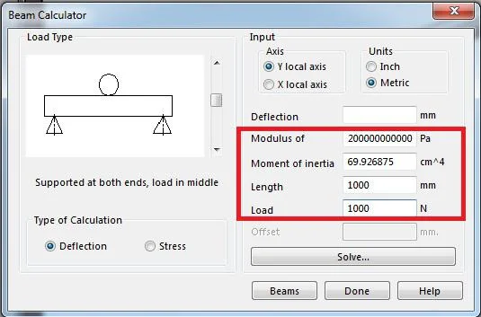 Let say for an example, If we want to calculate the Deflection for Simply Supported Beam having 1m [1000mm] with acting load of 1000N.