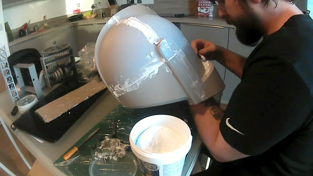 Once all the parts were printed, we glued them together with a two part epoxy glue. It’s stronger than super glue and allows you to align the parts before it cures. They all needed to cure for 2 hours before the next part was glued. When we had all the parts glued we used a filler to fill up the gaps. We were generous with it as the filler sands easy. It also means we don’t have to go back and fill parts again.