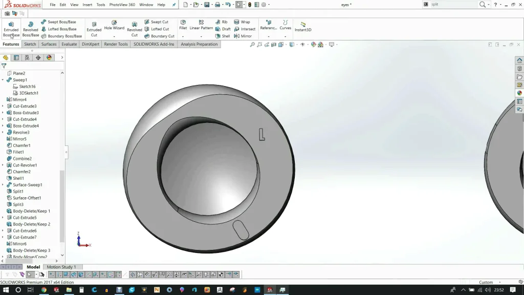 To create the model we used a revolve to make the head, a sweep for the Mohawk and basic extrudes and cuts to make the eyes and jaw. Finished it with chamfers and then finished the eyes. I then added a little marker to know what orientation it should be placed once printed.