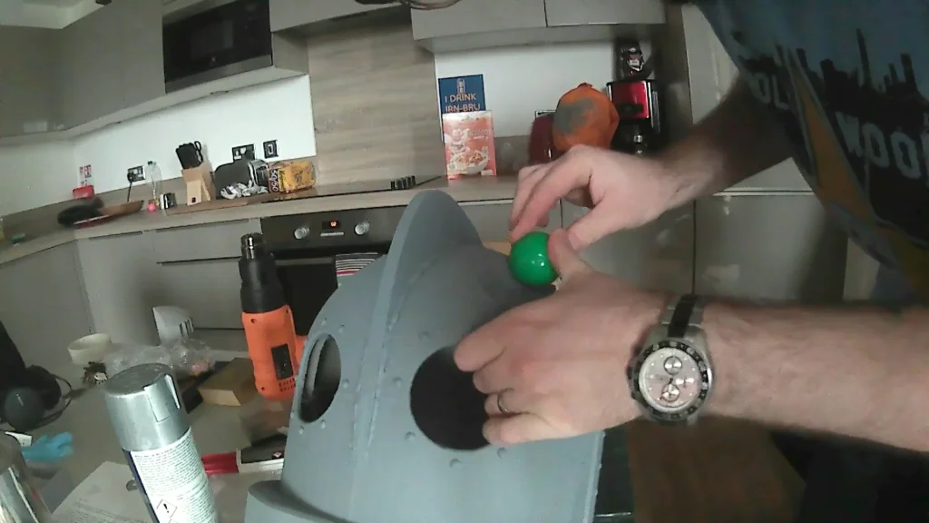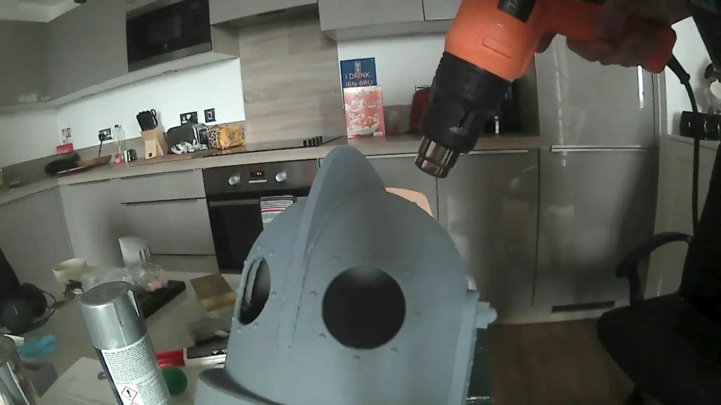 To make the rivets we used silicone dots. The kind that is used to stop items moving around. We stuck them on and cleaned them with acetone. The dent on the iron giants head was the last detail was done by heating an area with a heat gun. We then rolled a golf ball on the surface creating the dent. We left it to cool before we started with he final paint layers.