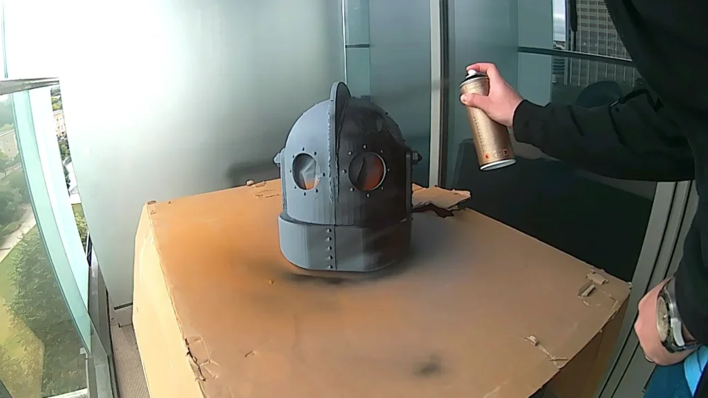We then painted a matte black spray on the helmet. We used black as the under coat because any gaps the silver paint misses it looks dirty instead of looking like you missed a spot.