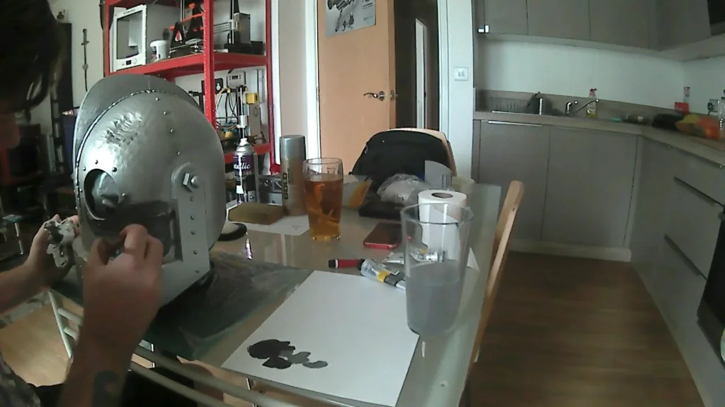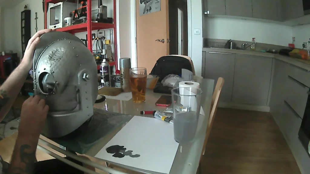 Once the last silver coat was applied and dried it was time we weathered the helmet. We made a dark grey paint, then watered it down and spread it all over the surface of the helmet. We then used a paper towel to wipe it away. The effect we going for is like the helmet got dirty and was wiped clean. Dirt will still be left in the deeper grooves.