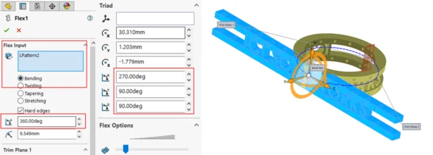 Step 3: Use feature ‘flex’ to bend the flat model to cylindrical shape. First, select the model in Flex input and select Bending. Then, input 360 degree for bend angle. Finally, change the X, Y, Z rotation angle to 270, 90 and 90 degree respectively ( X, Y, Z rotation angle use for determine the bend direction and location).